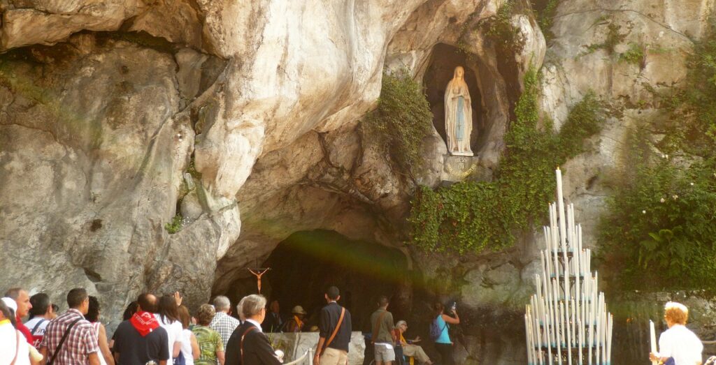 Era 11 de fevereiro de 1858. Bernadette, filha de uma família pobre, recolhia lenha nas proximidades da gruta de Massabielle quando viu “uma Senhora vestida de branco, com uma faixa azul na cintura e um rosário entre os dedos”. Ao longo de 18 aparições, a Virgem pediu oração, penitência e a construção de uma capela.