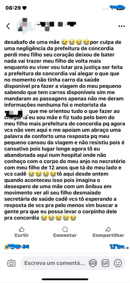 No desabafo publicado na internet, a mãe afirmou que, segundo ela, a Prefeitura de Concórdia não disponibilizou transporte especializado para o deslocamento. Ela relatou ter recebido apenas as passagens de ônibus para a viagem, sem orientações adicionais. Segundo o relato, o motorista da empresa responsável auxiliou com informações durante o percurso.