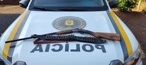Em vistoria ao local, foi localizada uma espingarda calibre 28 e uma cartucheira com munições, caracterizando também o crime de posse irregular de arma de fogo.