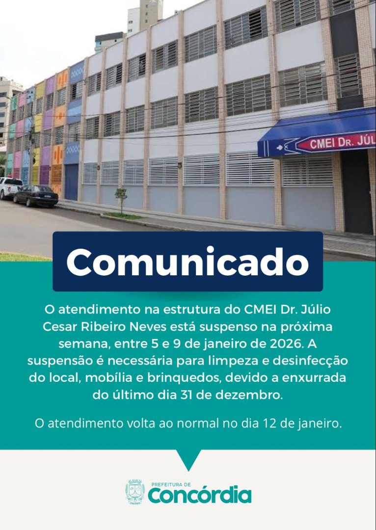 A suspensão das atividades no CMEI ocorre para permitir a execução dos serviços de limpeza, desinfecção e substituição dos materiais danificados pela água. A Prefeitura reforça que os pais e responsáveis devem acompanhar para novas informações e orientações, e garante que todas as medidas estão sendo adotadas para que o atendimento seja retomado em condições seguras no dia 12 de janeiro.