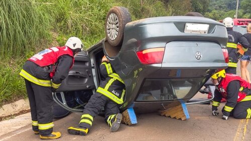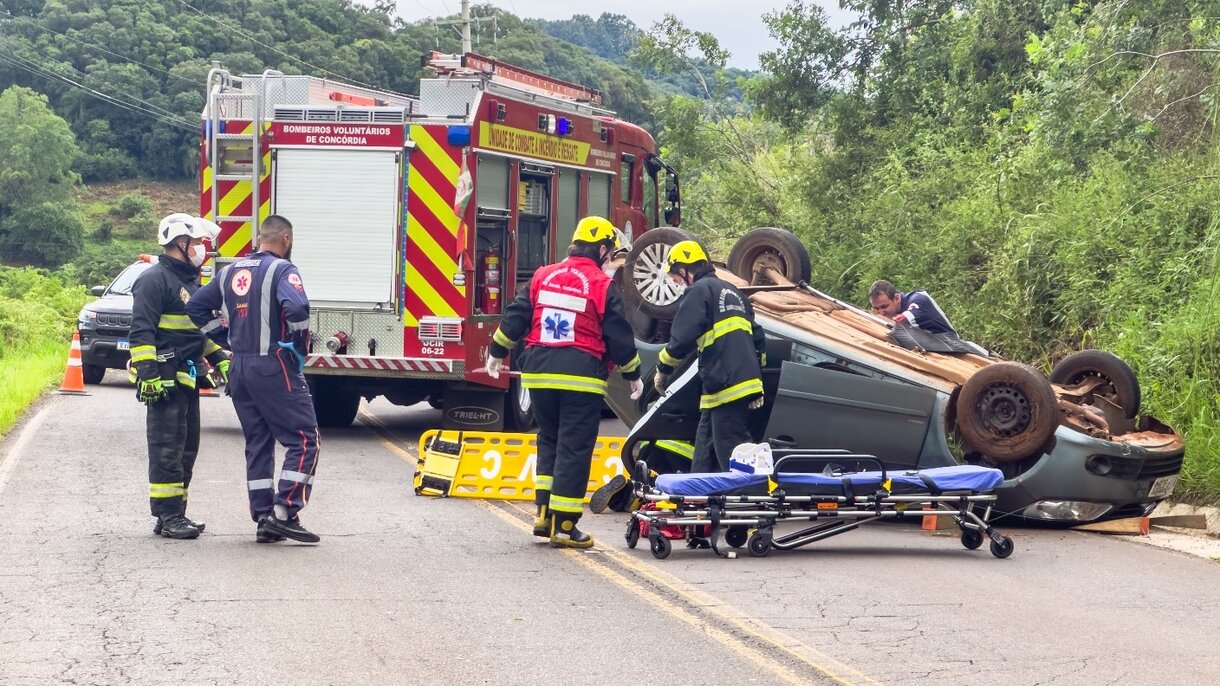 No interior do veículo, um VW Voyage, placas de Concórdia, apenas o condutor de 80 anos, que estava com uma das pernas presas próximo ao painel e necessitou do auxílio da guarnição de Resgate dos Bombeiros Voluntários, para que o retirassem do interior do automóvel.