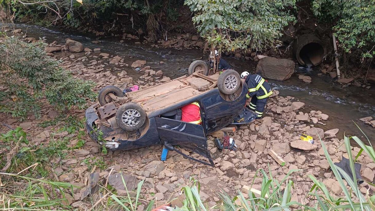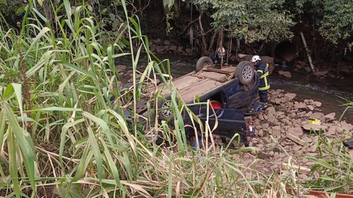 Ao chegar no local, os resgatistas se depararam com o veículo com o rodado para cima e a vítima, de 44 anos, em seu interior. Conforme o repórter Sérginho Primam, que esteve no loca, a vítima estava comunicativa e com dor na região cervical. Conforme pessoas que chamaram os Bombeiros, o acidente só não foi mais grave, pois o rio estava vazio. Caso contrário, o automóvel poderis ficar submerso, complicando a situação da vítima e do resgate dos Bombeiros.