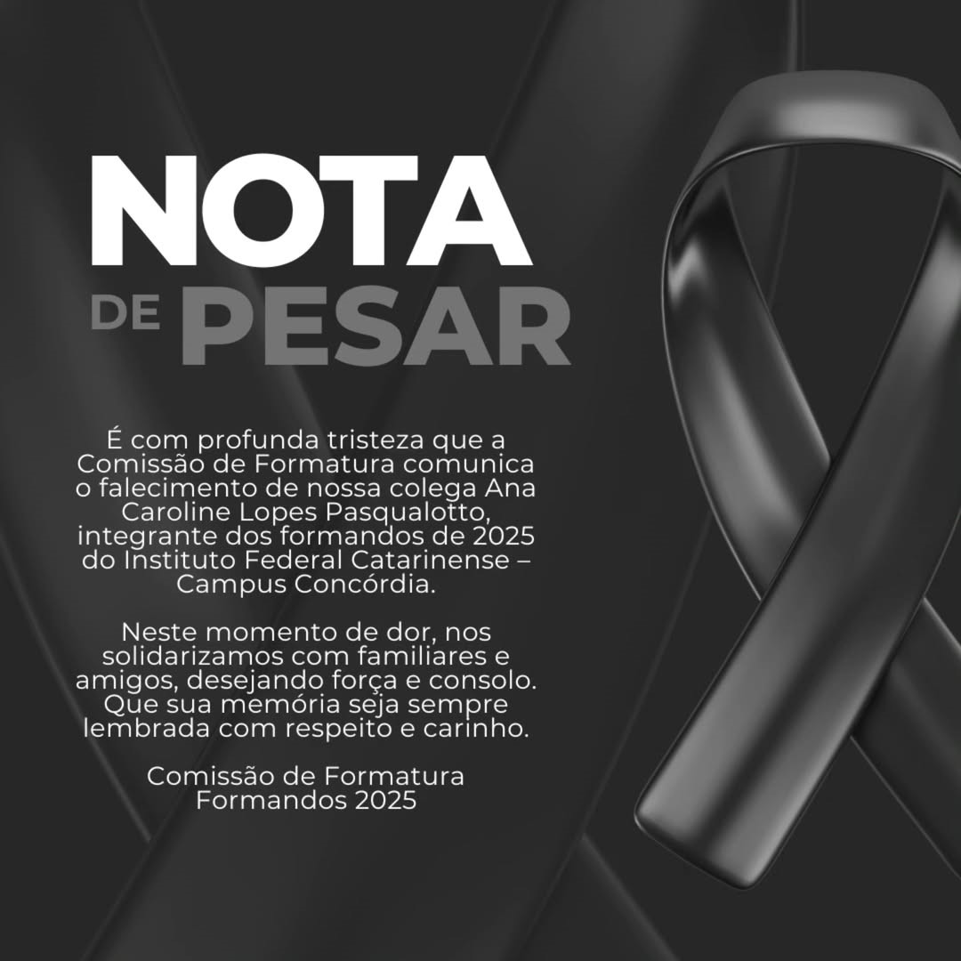 É com profunda tristeza e imenso pesar que a Comissão de Formatura comunica o falecimento de nossa querida colega Ana Caroline Lopes Pasqualotto, integrante dos formandos de 2025 do Instituto Federal Catarinense – Campus Concórdia.