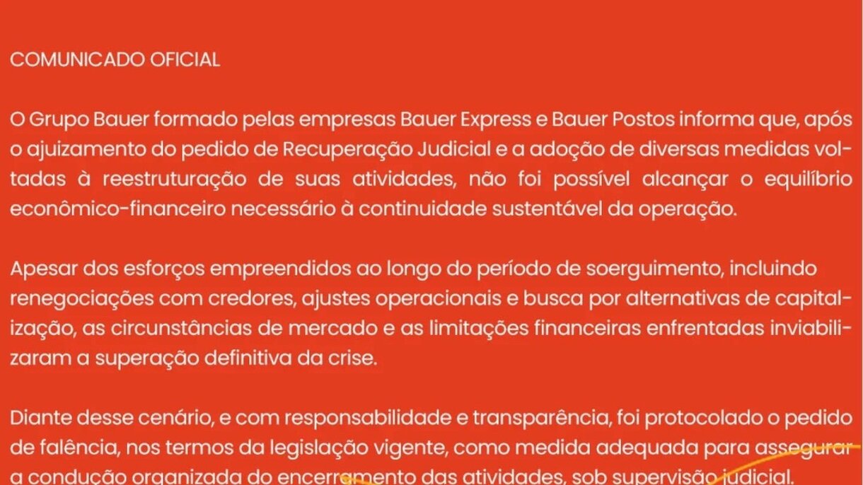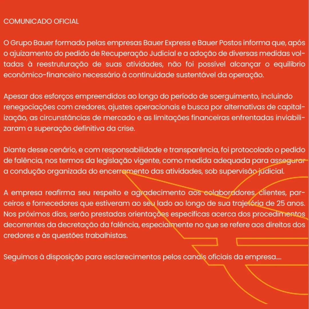 Na nota, o grupo também reafirma respeito e agradecimento aos colaboradores, clientes, parceiros e fornecedores que acompanharam sua trajetória ao longo de 25 anos de atuação. Segundo o comunicado, nos próximos dias deverão ser divulgadas orientações específicas sobre os procedimentos decorrentes da decretação da falência, especialmente no que diz respeito aos direitos dos credores e às questões trabalhistas.