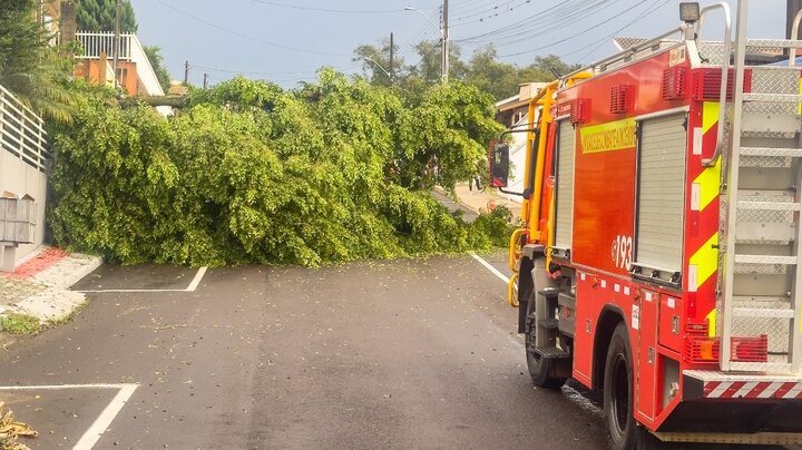 Na Rua Luis Sandi, no Parque de Exposições, uma árvore de grande porte caiu com o vento e obstruiu completamente a via. Os Bombeisos Voluntários fizeram o corte e liberação da rua ainda no início da noite desta sexta.