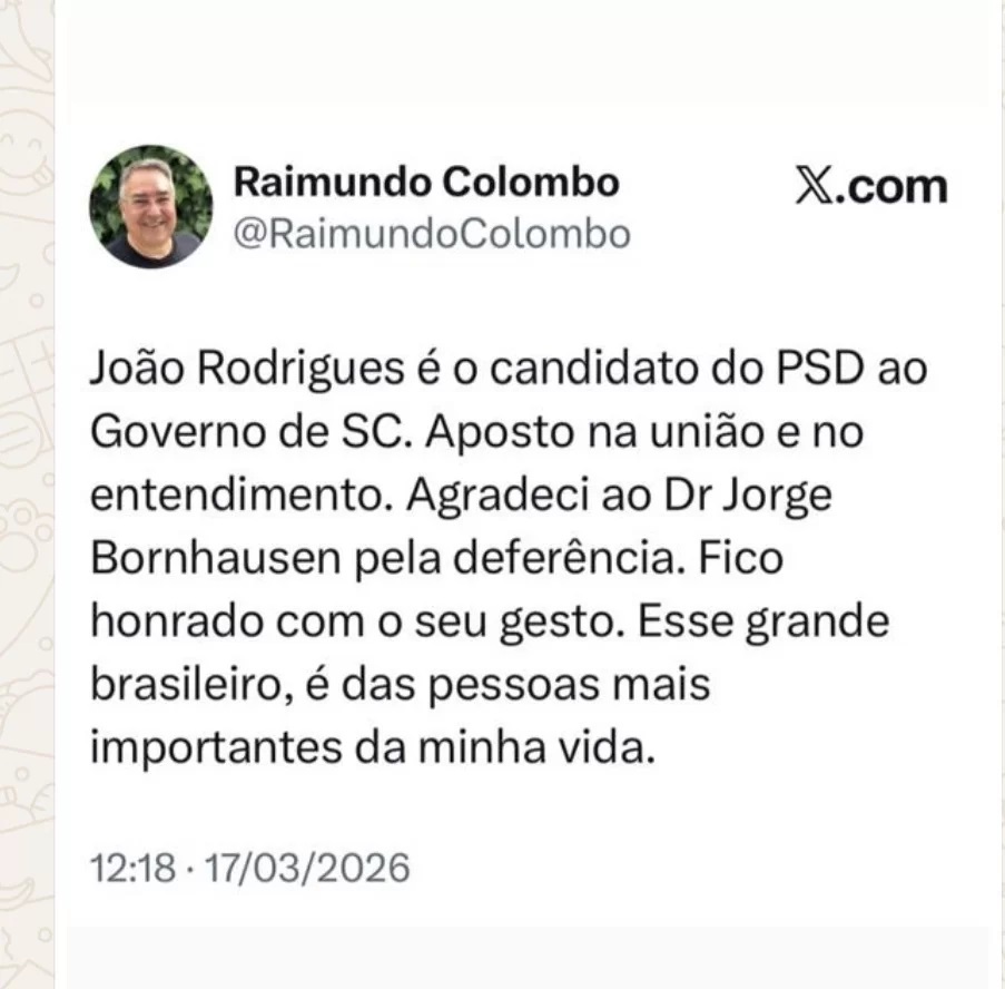 O ex-governador de Santa Catarina, Raimundo Colombo, utilizou as redes sociais na tarde desta terça-feira (17) para se posicionar sobre o cenário político estadual e reforçar apoio ao nome do prefeito de Chapecó, João Rodrigues, como pré-candidato do Partido Social Democrático (PSD) ao Governo do Estado.