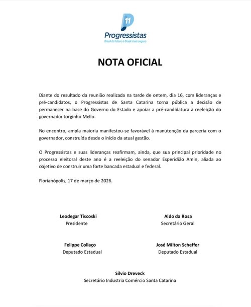 De acordo com nota oficial divulgada pelo partido, a ampla maioria dos presentes manifestou-se favorável à manutenção da parceria com o governo estadual, construída desde o início da atual gestão. A sigla também reforçou que sua principal prioridade no processo eleitoral deste ano será a reeleição do senador Esperidião Amin, além do fortalecimento de bancadas tanto no âmbito estadual quanto federal.