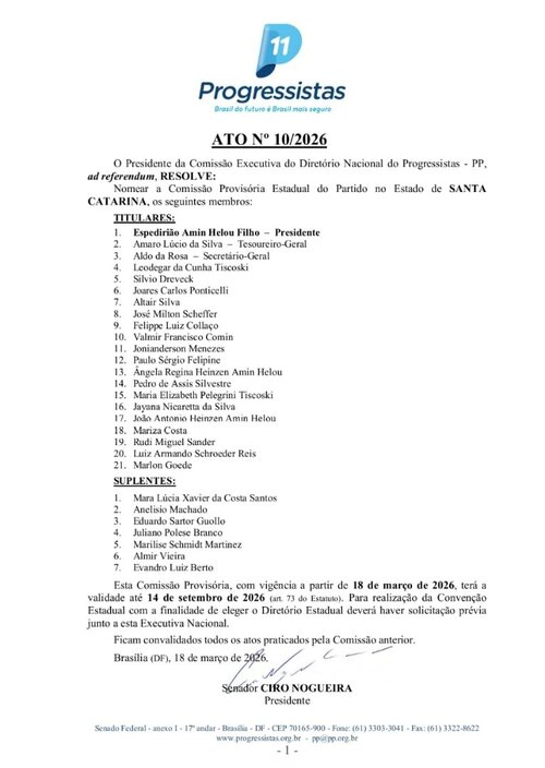 Paralelamente à definição política, o diretório nacional do Progressistas publicou o Ato nº 10/2026, que institui a Comissão Provisória Estadual da legenda em Santa Catarina. O documento foi assinado pelo presidente nacional do partido, o senador Ciro Nogueira.