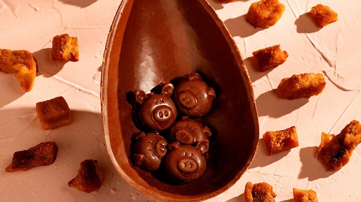 A criação integra uma caixa temática chamada PigBox, que reúne um ovo de Páscoa de chocolate com torresmo, mini porquinhos de chocolate com bacon tostado no interior do ovo e um pacote de torresmo. A proposta é transformar a degustação em uma experiência sensorial inusitada, combinando o doce do chocolate com elementos salgados e crocantes.