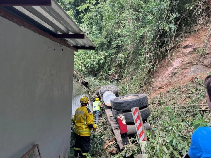 VÍDEO: Caminhão e carro despencam em barranco no centro de Seara