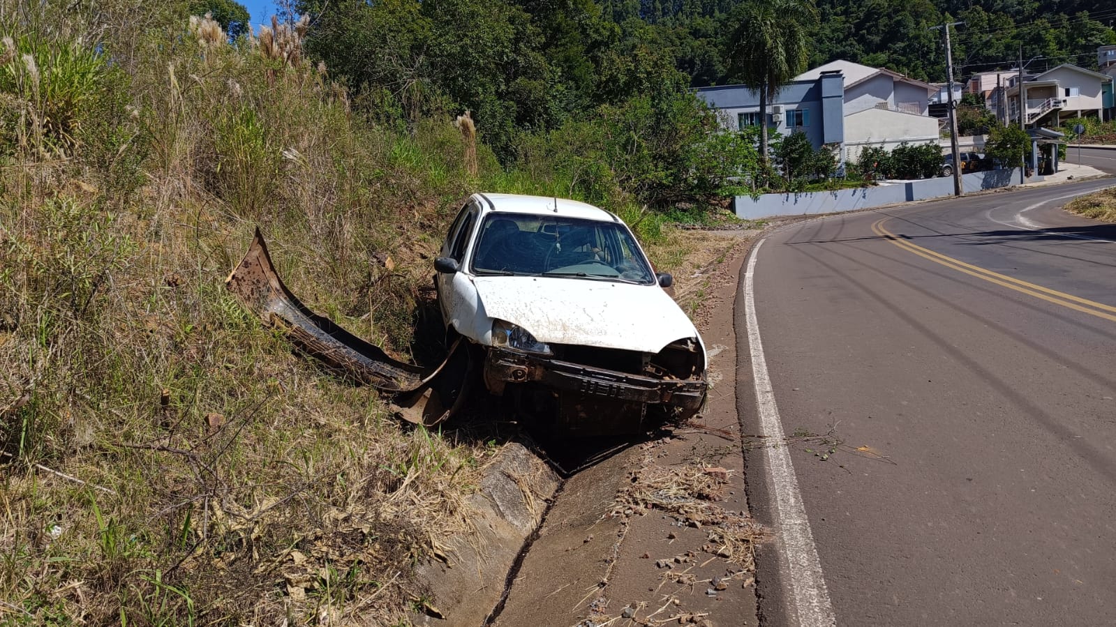 Um morador que estava nas proximidades explicou que no Ford/Fiesta com placas do Mercosul estavam duas pessoas, motorista e carona. Conforme apurado no local, ambos tinham apenas ferimentos leves e foram conduzidos por terceiros ao hospital. O motorista explicou a populares que perdeu o controle do carro por causa da falta de freios.