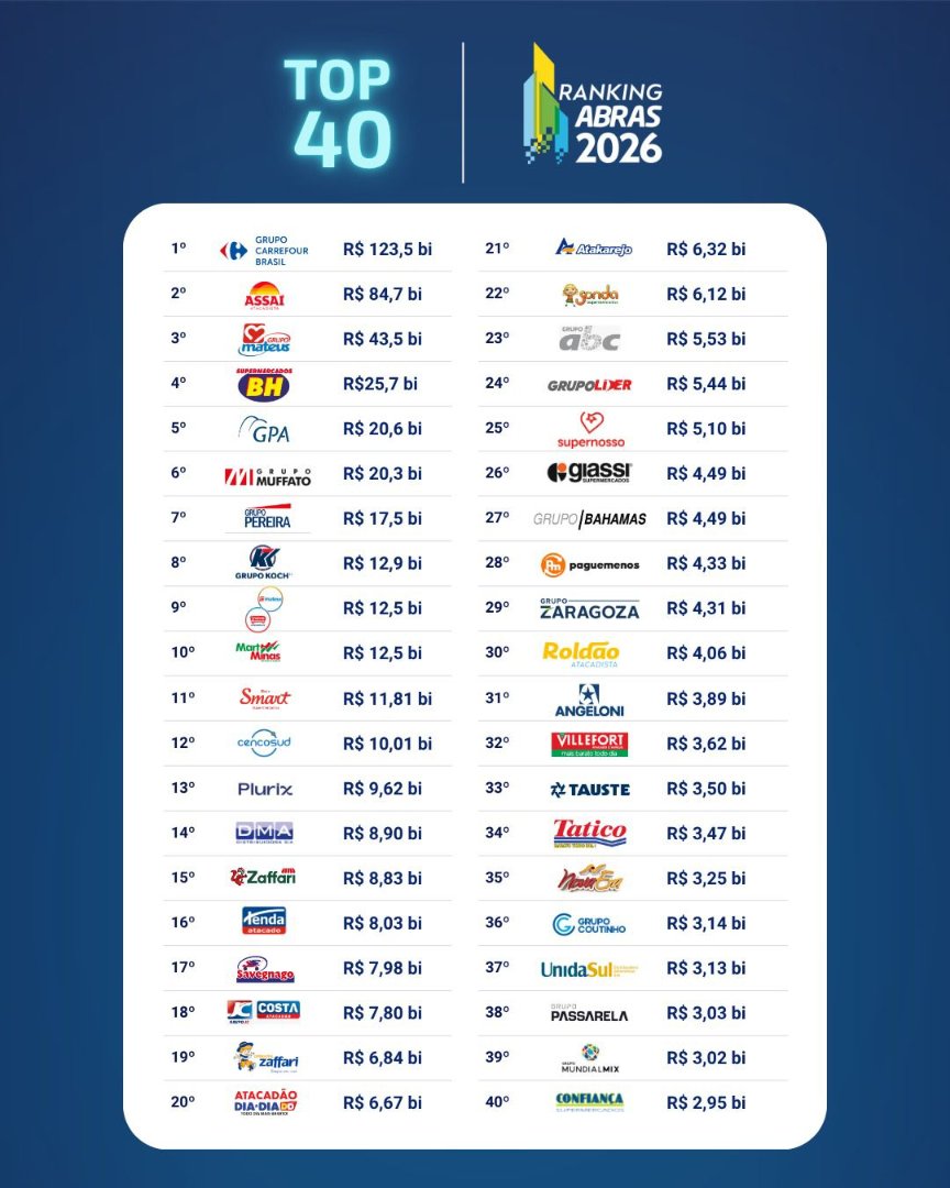 Entre as 40 maiores redes supermercadistas do Brasil, o Grupo Carrefour Brasil manteve a liderança pelo décimo ano consecutivo, com faturamento de R$ 123,5 bilhões em 2025. Em segundo lugar, aparece o Assaí Atacadista, com R$ 84,7 bilhões, seguido pelo Grupo Mateus, com R$ 43,5 bilhões.